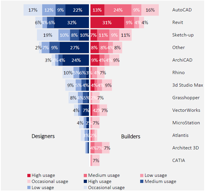 AutoCAD, Revit and SketchUp are the most popularly used software for building design and as-built drawings. Two thirds (60%+) of designers and builders use AutoCAD followed by Revit, SketchUp and ArchiCAD (see Figure 3.10). One third (31%) of designers have a very good level of usage of AutoCAD (Medium – High). Usage of Revit is high in around a third (32%) of designers followed by high usage of ArchiCAD by a quarter (25%) of designers. There is no significant difference between designers and builders in their usage level of the identified popular software.