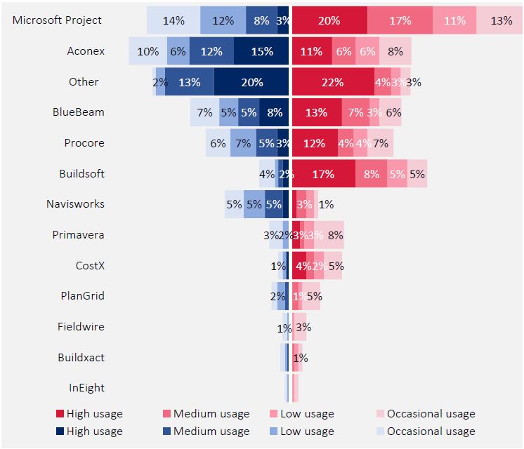 Microsoft Project for schedule management, Aconex for document management and Buildsoft for cost management are the most popular software used by designers and builders, as shown in Figure 3.11. 37% of the designers and 61% of builders use Microsoft Project while Primavera is used by a significantly lesser number of organisations (5% and 14% respectively). Nearly 42% of designers and 31% of builders use Aconex as a document management software. This is followed by Procore which has overall 27% usage. Buildsoft is used by over 35% of the builders followed by Aconex with over 32% and BlueBeam over 29%. Cost management software does not seem to be much used by builders except for Buildsoft which is used by 35% at various levels. However, the survey only focuses on designers and builders and expressly excludes quantity surveyors working in the consultancy sector. Furthermore, builders use MS Project significantly more while designers use Aconex significantly more. Micro and small designers and builders use MS Project and Aconex significantly less than medium and large players.