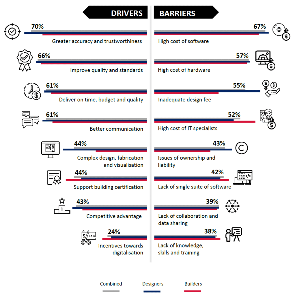 Understanding how the industry players feel about barriers to digitalisation of their organisations provides a crucial insight into developing a strategy for digitisation. High cost of software purchase/licensing is considered the most important barrier, including price and non-price conditions that create impediments to switching. This is followed by the high cost of digital tools and setting up equipment. Both designers and builders feel that the cost of software and hardware seems to make digitalisation more difficult. Inadequate design fee to support digital innovation is the third most rated barrier for digitalisation, mainly because it was deemed as the second biggest barrier by Designers, although it was only ranked sixth by Builders.   The High cost of IT specialists was rated the fourth biggest barrier, as it has been ranked as the fourth and the second biggest barrier by designers and builders, respectively.