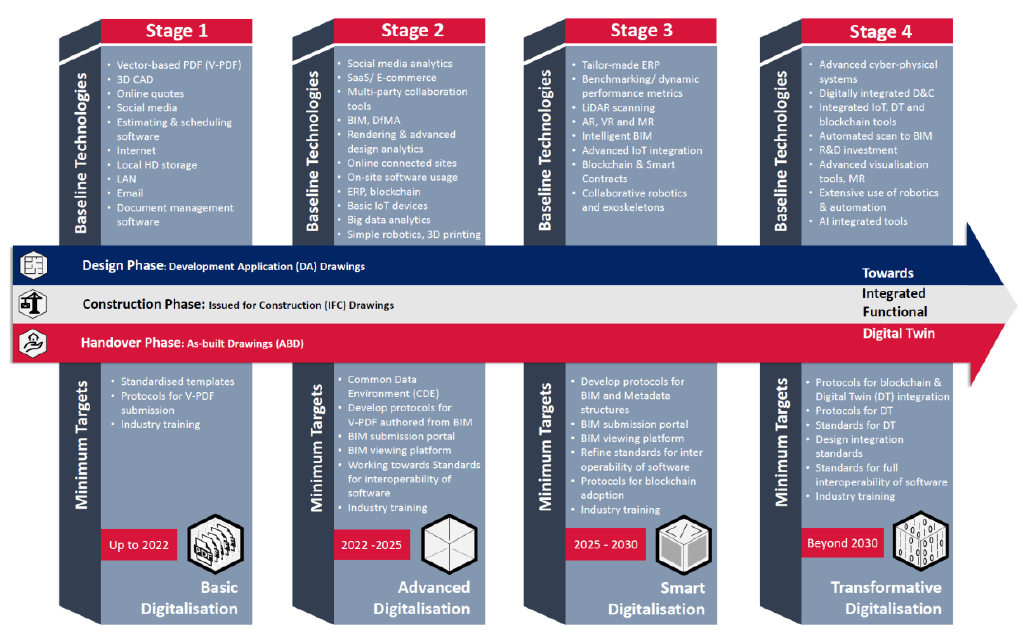 Stage 3 indicates the smart use of digital technologies across the sector that needs to be achieved by 2030. This stage will see rapid proliferation of technologies across the industry where buildings become smarter and intelligent. It is characterised by online platforms and automated supply chain management systems and the use of technologies such as advanced ERP systems, LiDAR scanning technologies, AR, VR and MR visualisation technologies, intelligent BIM, collaborative robotics, advanced blockchain and smart contracts-based systems. Minimum targets to achieve includes the development of BIM and metadata structures, BIM submission portals, Blockchain adoption protocols and more refined standards for interoperability of software.