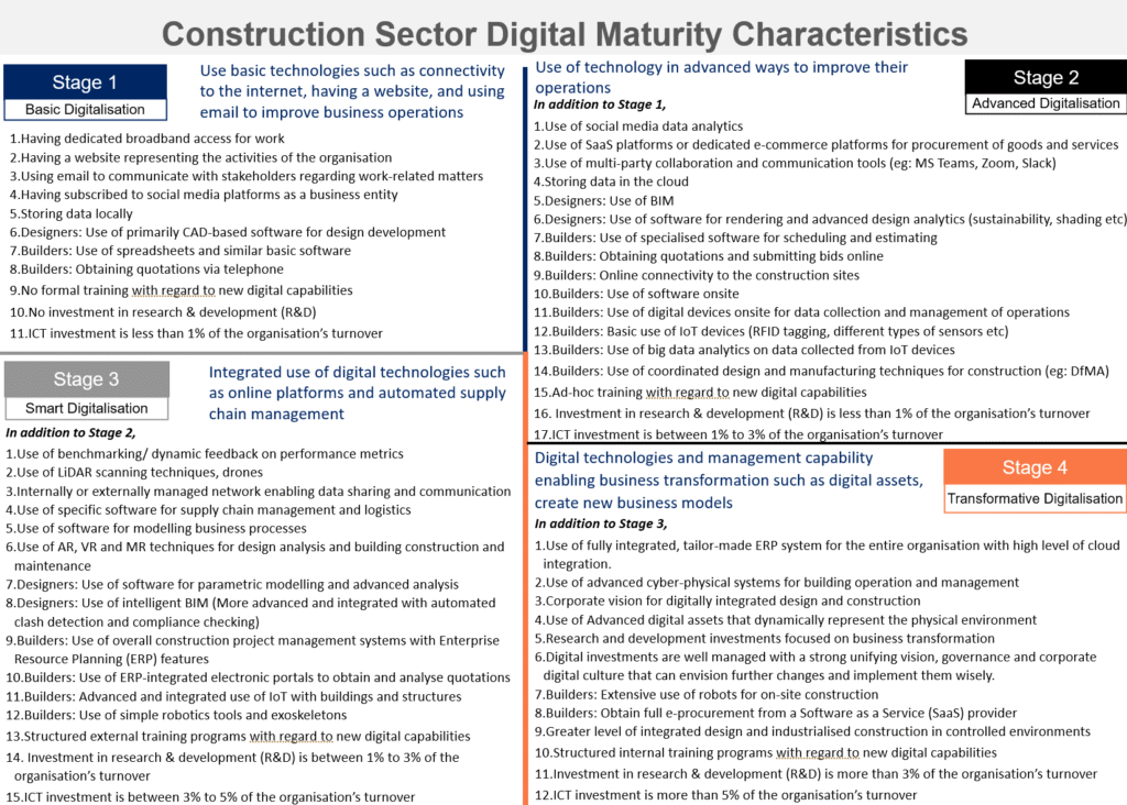 Stage 2 indicates an advance level of digitalisation that needs to be achieved by 2025. It is characterised by the use of technology in advanced ways to improve their operations both as a design and/or construction organisation. This stage envisages the use of technologies such as SaaS and cloud-based software, data analytics, BIM, DfMA processes, rendering and advanced design analytics, ERP systems, basic IoT devices, basic blockchain systems, 3D printing, simple robotics, among others. Stage 2 also indicates the targets of achieving a common data environment (CDE), BIM submission portals, BIM viewing platforms and working towards interoperability of software.